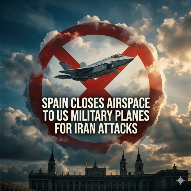 স্পেনের আকাশসীমা মার্কিন সামরিক বিমানের জন্য বন্ধ ঘোষণা করা হয়েছে।ইরানে হামলার সঙ্গে জড়িত মার্কিন বিমানগুলো এখন থেকে আর স্পেনের আকাশপথ ব্যবহার করতে পারবে না।দেশটি এর আগে তাদের যৌথ সামরিক ঘাঁটি ব্যবহারের অনুমতি দিতে অস্বীকৃতি জানিয়েছিল, এবার আকাশপথও বন্ধ করে দিয়ে সেই অবস্থান আরও কঠোর করল।