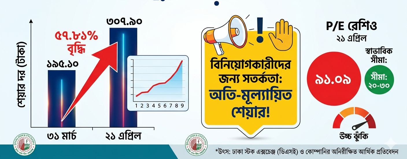 উচ্চ পি/ই রেশিও: ২১ এপ্রিলের তথ্য অনুযায়ী, কোম্পানিটির পি/ই রেশিও (P/E Ratio) দাঁড়িয়েছে ৯১.০৯ (অনিরীক্ষিত) এবং ৮৫.৫৩ (নিরীক্ষিত)। এই অতি উচ্চ পি/ই রেশিও নির্দেশ করে যে শেয়ারটি বর্তমানে অনেক বেশি ঝুঁকিপূর্ণ অবস্থানে রয়েছে।