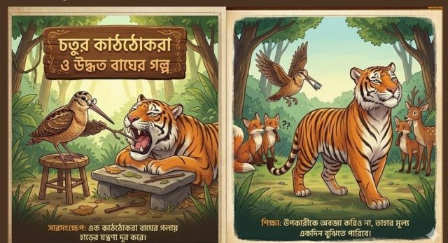 এক ঘন জঙ্গলে এক বিশাল বাঘ বাস করত। সে ছিল খুব উদ্ধত এবং বনের সব প্রাণীকে ভয় দেখাত। বাঘের এক বিচিত্র অভ্যাস ছিল—সে শিকার করার পর মাংস খাওয়ার চেয়ে হাড় চিবুতে বেশি পছন্দ করত। একদিন হাড় চিবুতে গিয়ে একটি ধারালো হাড়ের টুকরো তার গলার গভীরে আটকে গেল। বাঘ যন্ত্রণায় ছটফট করতে লাগল, কিন্তু হাড়টি বের করতে পারল না।