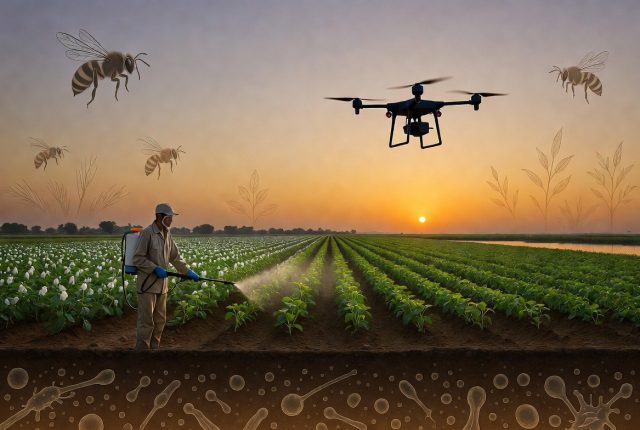আধুনিক কৃষিব্যবস্থায় ফসলের সুরক্ষা নিশ্চিত করতে কীটনাশক এখন এক অবিচ্ছেদ্য অংশ হয়ে দাঁড়িয়েছে। তুলা চাষ থেকে শুরু করে সবজি উৎপাদন—সবখানেই ফলন রক্ষা এবং কৃষকের আয় স্থিতিশীল রাখতে এর ব্যাপক ব্যবহার লক্ষ্য করা যায়। তবে গত কয়েক দশক ধরে আলোচনা কেবল ‘কী পরিমাণ কীটনাশক ব্যবহার করা হচ্ছে’ তার মধ্যে সীমাবদ্ধ থাকলেও, বর্তমানে একটি অস্বস্তিকর প্রশ্ন সামনে আসছে: এই সুরক্ষার পরিবেশগত মূল্য কত এবং শেষ পর্যন্ত এই দায়ভার কে বহন করছে?