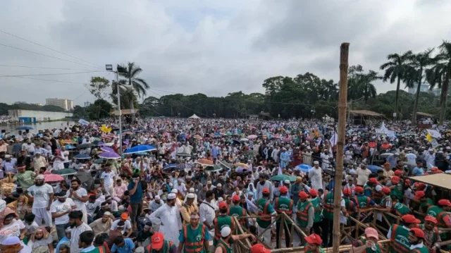জামায়াতের নেতাদের ভাষ্য, এটাই তাদের স্মরণকালের সবচেয়ে বড় জনসমাগম। শুক্রবার সন্ধ্যা থেকেই দেশের নানা প্রান্ত থেকে বাস, ট্রেন ও লঞ্চে করে রাজধানীতে পৌঁছাতে শুরু করেন নেতাকর্মীরা। ভোররাত থেকেই মিছিলের মধ্য দিয়ে তারা উদ্যানে প্রবেশ করেন।