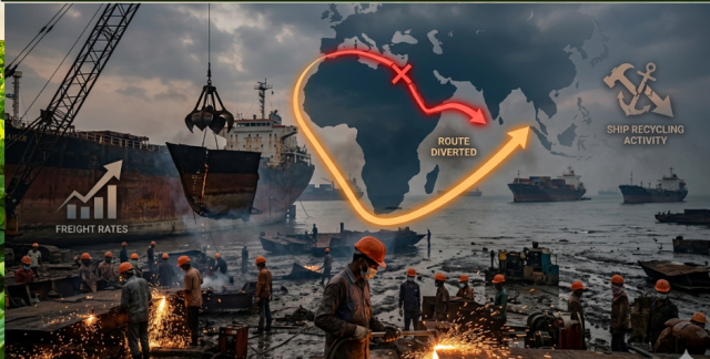 সংকটের মূল কারণ: ১. লোহিত সাগর ও ফ্রেইট রেট:Xeneta এবং BIMCO-এর রিপোর্ট অনুযায়ী, লোহিত সাগরে হুতি বিদ্রোহীদের হামলার কারণে জাহাজগুলোকে উত্তমাশা অন্তরীপ দিয়ে দীর্ঘ পথ ঘুরতে হচ্ছে। এতে জাহাজের চাহিদা বেড়ে যাওয়ায় মালিকরা পুরনো জাহাজ স্ক্র্যাপ না করে উচ্চ ভাড়ায় (Freight Rate) কাজ চালাচ্ছেন। ২. হংকং কনভেনশন (HKC): আন্তর্জাতিক মেরিটাইম অর্গানাইজেশন (IMO) কর্তৃক হংকং কনভেনশন কার্যকর হওয়ার ফলে এখন কেবল নিরাপদ ও পরিবেশবান্ধব ইয়ার্ডে জাহাজ ভাঙা বাধ্যতামূলক। এর ফলে অনেক সাধারণ ইয়ার্ড জাহাজ কিনতে পারছে না, যা সরবরাহে আরও চাপ তৈরি করেছে। ৩. ইস্পাতের চাহিদা:Business Research Insights-এর তথ্যমতে, বিশ্বব্যাপী রিসাইকেল করা ইস্পাতের চাহিদা বাড়লেও (যা মোট ইস্পাত উৎপাদনের ৬০% যোগান দেয়), কাঁচামালের (পুরনো জাহাজ) অভাবে উৎপাদন ব্যাহত হচ্ছে।