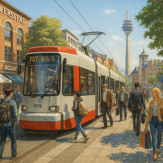 ডুসেলডরফের ট্রাম নেটওয়ার্ক বেশ বিস্তৃত। “ট্রাম লাইন 701 থেকে 708” শহরের মূল এলাকা, যেমন মাইনের্ডার, অ্যাল্টস্টাড্ট ও ক্যানাল রোডকে যুক্ত করে। এছাড়াও “স্টাডিয়ন রিং”, “হফগার্টেন” এবং “কোনিগসালে” পর্যন্ত ট্রাম পৌঁছায়। প্রতিটি স্টেশন পর্যাপ্ত আলো, নিরাপত্তা ব্যবস্থা এবং তথ্য প্রদর্শনের সুবিধা রয়েছে।