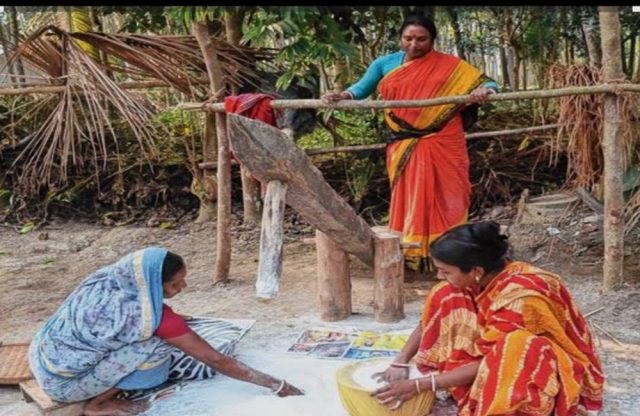ধান কেটে ঘরে আনার পর ঢেঁকিতে চাল বানানোর প্রস্তুতি চলত দিনের পর দিন। বাঁশ দিয়ে তৈরি ঢেঁকি, এক পাশে ভার দিয়ে ধান ভাঙা হতো পায়ের চাপে। সাধারণত নারীরাই এই কাজ করতেন। একেক বাড়ির উঠানে দাঁড়িয়ে দুই-তিনজন মিলে ঢেঁকি চালাতেন, সঙ্গে চলত হাসি, গান, গল্প। আর সেই শব্দ ছড়িয়ে পড়ত আশপাশে, ঘুম ভাঙত শিশুর, উঠত পাখির।