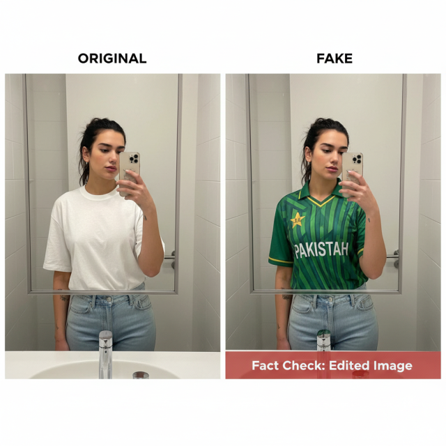 তবে তথ্য যাচাই করে দেখা গেছে, ছবিটি আসল নয়। এটি মূলত দুয়া লিপার একটি পুরোনো সেলফি, যেখানে তিনি সাদা টি–শার্ট পরেছিলেন। ফটোশপ কিংবা এআই–ভিত্তিক টুল ব্যবহার করে সেই ছবির পোশাকের অংশে পাকিস্তান ক্রিকেট দলের অফিসিয়াল জার্সি বসিয়ে দেওয়া হয়। মূল ছবিতে দুয়া লিপা একটি সাধারণ সাদা টি-শার্ট পরে ছিলেন, আর এডিটেড সংস্করণে সেই অংশে সবুজ জার্সি, পাকিস্তানের পতাকা ও লোগো যোগ করা হয়েছে। ঘনিষ্ঠভাবে লক্ষ্য করলে আলো–ছায়ার অমিল এবং পিক্সেলের অসংগতি স্পষ্ট হয়।