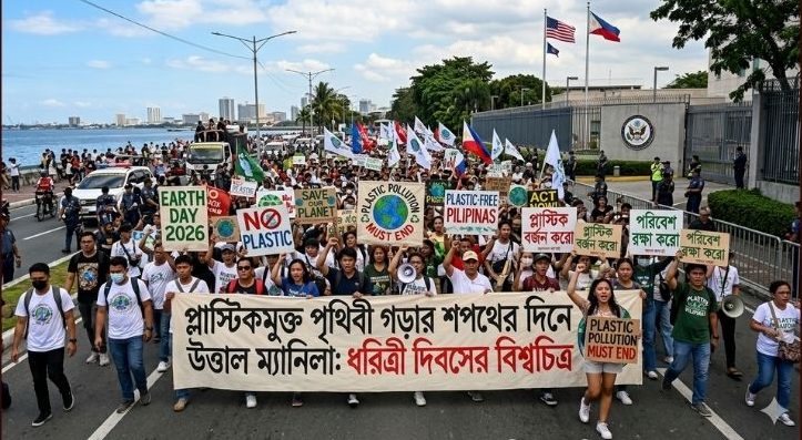 বিশ্বজুড়ে যখন পরিবেশ সচেতনতার ডাক দেওয়া হচ্ছে, ঠিক তখনই ফিলিপাইনের রাজধানী ম্যানিলায় ভিন্ন চিত্র দেখা গেছে। ধরিত্রী দিবস উপলক্ষে সেখানে মার্কিন দূতাবাসের সামনে এক বিশাল বিক্ষোভ সমাবেশ অনুষ্ঠিত হয়। বিক্ষোভকারীরা পরিবেশ ধ্বংসকারী বিভিন্ন কর্পোরেট নীতি এবং জলবায়ু সংকটে উন্নত দেশগুলোর ভূমিকার প্রতিবাদ জানান।