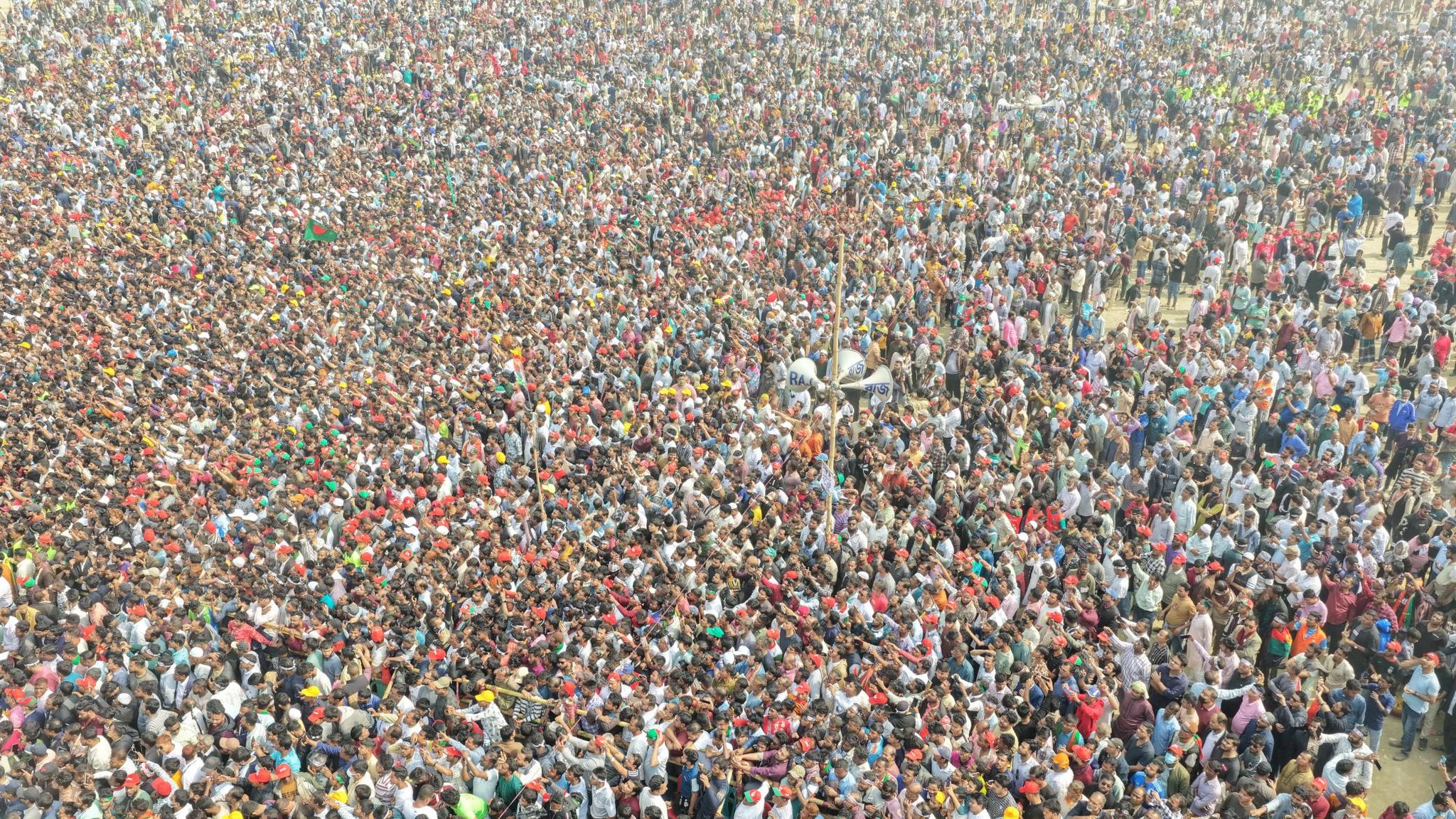 মাঠের মাঝখানে দাঁড়িয়ে চারদিকে তাকালে কেবল দিগন্ত বিস্তৃত মানুষের মাথার সারি চোখে পড়ে। উত্তপ্ত রোদেও নেতাকর্মীদের উচ্ছ্বাসে ভাটা পড়েনি; বরং হাতে ধরা ধানের শীষের গুচ্ছগুলো যখন একসাথে বাতাসে দুলছিল, তখন মনে হচ্ছিল যেন সোনালী শস্যের এক বিশাল ক্ষেত ঢেউ খেলছে জনসমুদ্রের বুকে।
