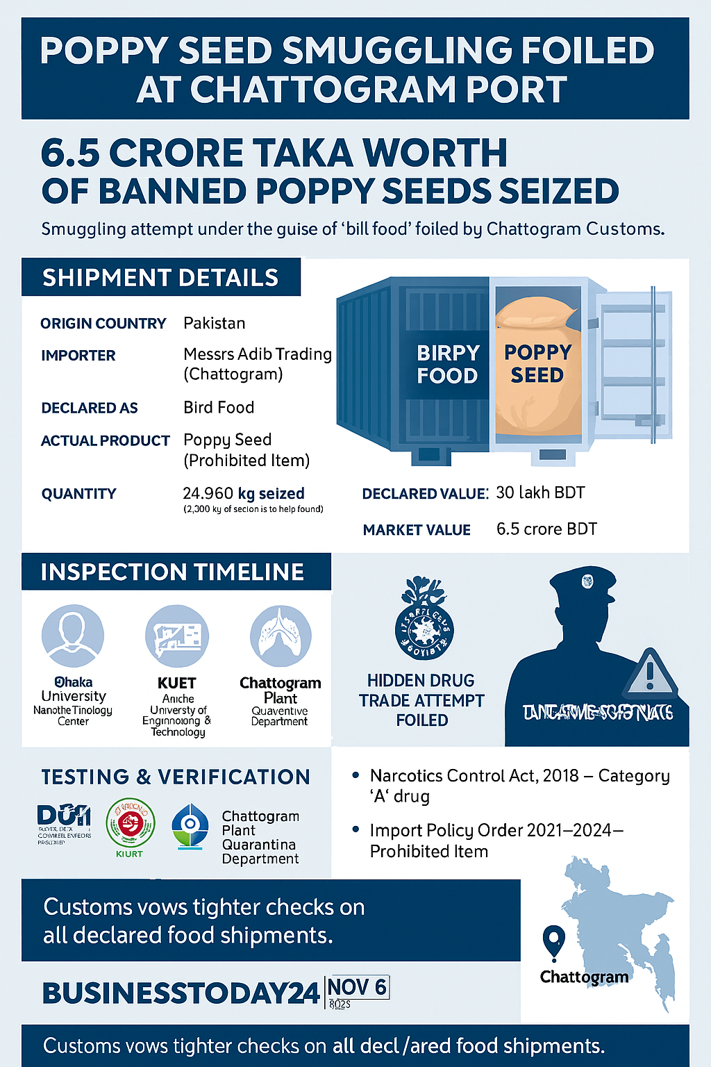 বিজনেসটুডে২৪ প্রতিনিধি, চট্টগ্রাম:  পাকিস্তান থেকে আমদানি করা “বার্ড ফুড” ঘোষণার আড়ালে প্রায় ২৪ হাজার ৯৬০ কেজি নিষিদ্ধ পোস্তদানা (পপি সিড) জব্দ করেছে কাস্টমস কর্তৃপক্ষ। চালানটির আনুমানিক বাজারমূল্য প্রায় ৬ কোটি ৫০ লাখ টাকা।