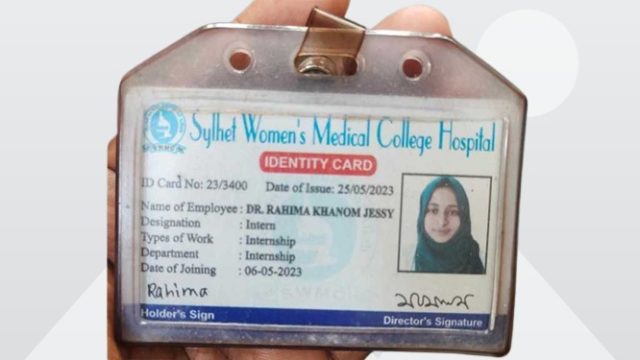 নিহত চিকিৎসকের নাম রহিমা খানম জেসি। বয়স ৩২ বছর। তিনি সিলেট উইমেন্স মেডিকেল কলেজ হাসপাতালে কর্মরত ছিলেন। তার বাড়ি দক্ষিণ সুরমা এলাকায়।