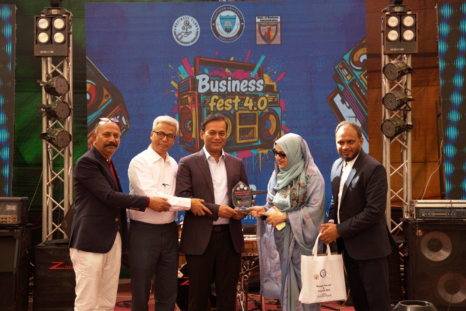 ফেস্টের প্রধান অতিথি ছিলেন নাহার এগ্রো গ্রুপের ব্যবস্থাপনা পরিচালক এবং বিশ্ববিদ্যালয়ের গর্বিত অ্যালামনাই মো. রাকিবুর রহমান ( টুটুল)। তিনি যেন তরুণদের সামনে দাঁড়িয়ে তাদের ভবিষ্যতের পথচিত্র এঁকে দিলেন। বক্তব্যে তিনি বলেন, কর্পোরেট দুনিয়া এখন এক অন্তহীন প্রতিযোগিতার পথ। সেখানে এগিয়ে যেতে আধুনিক দক্ষতা, প্রযুক্তিজ্ঞান ও বাস্তব চ্যালেঞ্জ সামলানোর ক্ষমতাই শিক্ষার্থীদের সবচেয়ে বড় শক্তি। পরে দেশের অর্থনীতিতে বিশেষ অবদানের জন্য তাকে ‘সেরা উদ্যোক্তা ২০২৫’ সম্মাননা দেওয়া হয়। শিক্ষার্থীদের করতালি তখন যেন আকাশ ছুঁয়েছিল।