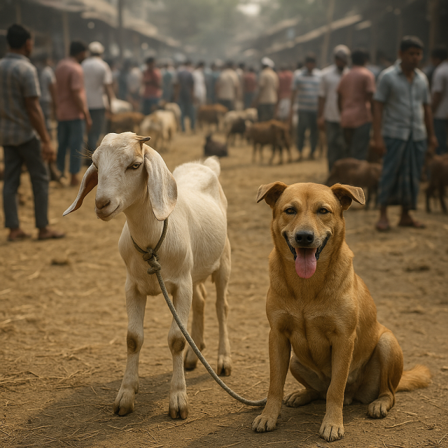 বিজনেসটুডে২৪ প্রতিনিধি, চাঁদপুর: লাকসাম রোডের পাশের চাঁদপুর পশুরহাট আজ অন্যান্য দিনের মতোই গমগম করছে। ধুলোবালি, হাঁকডাক, দরদাম, সব যেন আগের মতোই। কিন্তু হাটের এক কোণে দাঁড়িয়ে ছিল এমন এক দৃশ্য, যা চাইলেও চোখ ফিরিয়ে থাকা যায় না। ছাগলটি রশিতে বাঁধা, পাশে বসে রয়েছে এক মধ্যবয়সী দেশি কুকুর, জিভ বের করে নিঃশ্বাস নিচ্ছে। দেখে মনে হচ্ছে, ছাগলটিকে পাহারা দিচ্ছে। অথচ সত্যিটা আরও গভীর।
