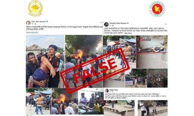 আরেকটি বহুল প্রচারিত পোস্টে দেখা যায়, জাকির হোসেন এবং সাবেক প্রধানমন্ত্রী শেখ হাসিনার উপ-প্রেস সচিব আশরাফুল আলম খোকন একটি ছবি পোস্ট করেন, যেখানে গোয়েন্দা শাখার (ডিবি) এক কর্মকর্তা বিক্ষোভকারীদের দিকে গুলি ছুড়ছেন।