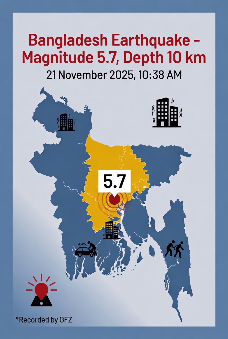 বিজনেসটুডে২৪ প্রতিনিধি, ঢাকা: আজ শুক্রবার সকাল ১০:৩৮ মিনিটে রাজধানী ঢাকা, সিলেটসহ বিভিন্ন এলাকায় একটি শক্তিশালী ভূমিকম্প অনুভূত হয়েছে। German Research Centre for Geosciences (GFZ) অনুসারে ভূমিকম্পের মাত্রা ছিল ৫.৭ এবং এটি প্রায় ১০ কিলোমিটার গভীরে ঘটে।