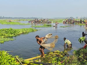 সকালের দিকে যখন সূর্যের আলো পানির ওপর ছায়া ফেলছিল, তখনই শত শত শিকারি নেমে পড়েন বাঁধে। কেউ নৌকায়, কেউ ভেলায়, কেউ বা হাঁটু–সমান কাদা পেরিয়ে জালে টান দেন প্রাণপণে। নারী-পুরুষ, বৃদ্ধ-বৃদ্ধা, কিশোর-কিশোরী—সবার চোখে এক ধরনের উচ্ছ্বাস, একধরনের গ্রামীণ প্রতিযোগিতার রোমাঞ্চ।
