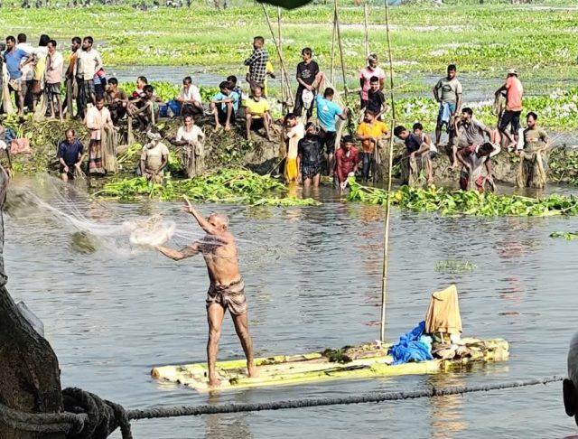 সকালের দিকে যখন সূর্যের আলো পানির ওপর ছায়া ফেলছিল, তখনই শত শত শিকারি নেমে পড়েন বাঁধে। কেউ নৌকায়, কেউ ভেলায়, কেউ বা হাঁটু–সমান কাদা পেরিয়ে জালে টান দেন প্রাণপণে। নারী-পুরুষ, বৃদ্ধ-বৃদ্ধা, কিশোর-কিশোরী—সবার চোখে এক ধরনের উচ্ছ্বাস, একধরনের গ্রামীণ প্রতিযোগিতার রোমাঞ্চ।