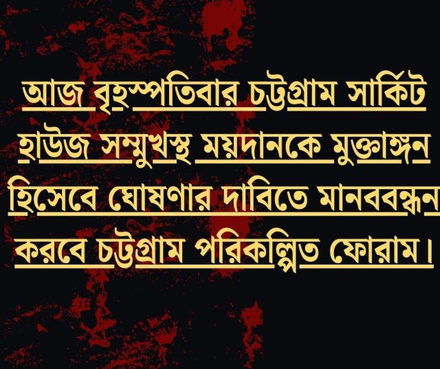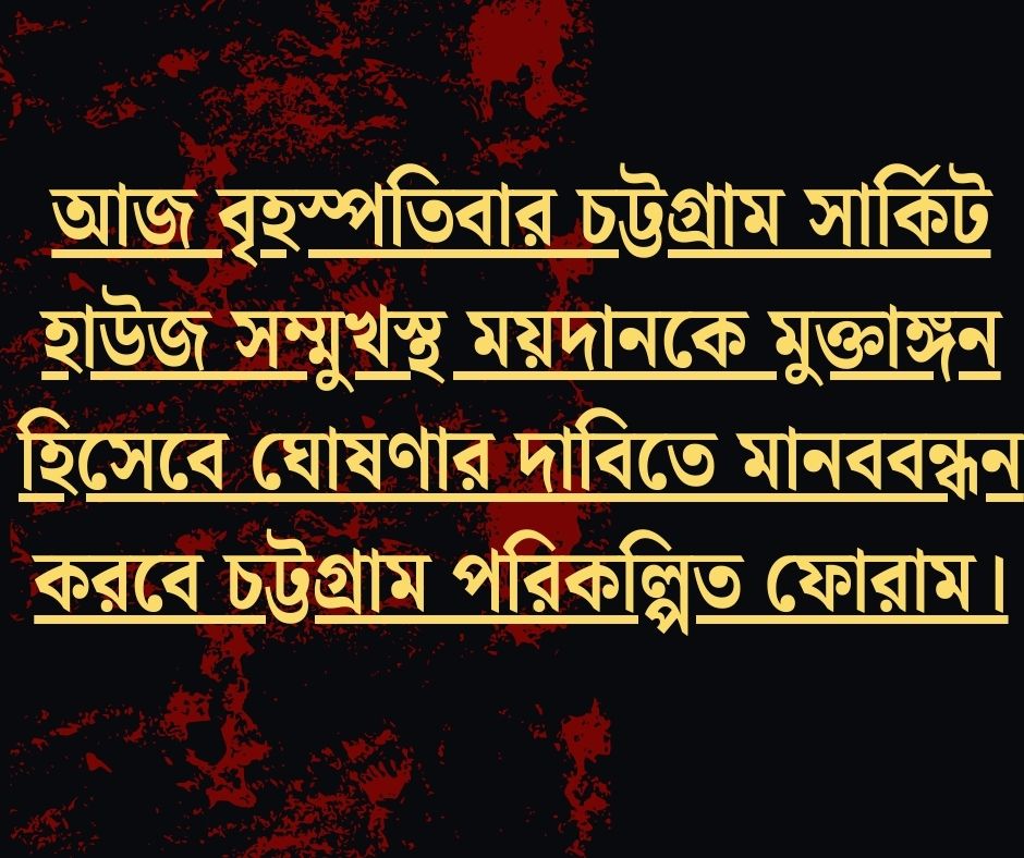চট্টগ্রাম:আজ বৃহস্পতিবার চট্টগ্রাম সার্কিট হাউজ সম্মুখস্থ ময়দানকে মুক্তাঙ্গন হিসেবে ঘোষণার দাবিতে মানববন্ধন করবে চট্টগ্রাম পরিকল্পিত ফোরাম।