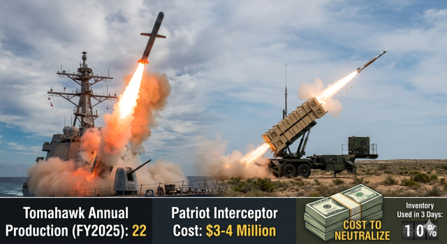 পেন্টাগনের তথ্যমতে, যুদ্ধের প্রথম তিন দিনেই যুক্তরাষ্ট্র প্রায় ৪০০ টমাহক ক্রুজ মিসাইল খরচ করেছে। এটি তাদের মোট মজুদের প্রায় ১০ শতাংশ। অথচ এই পরিমাণ মিসাইল তৈরি করতে তাদের কয়েক বছর সময় লাগে। বিপরীত দিকে, ইরান ও তার সহযোগীরা প্রতি মাসে শত শত ড্রোন তৈরি করছে, যা যুদ্ধের ময়দানে তাদের অবস্থানকে সংহত করছে।