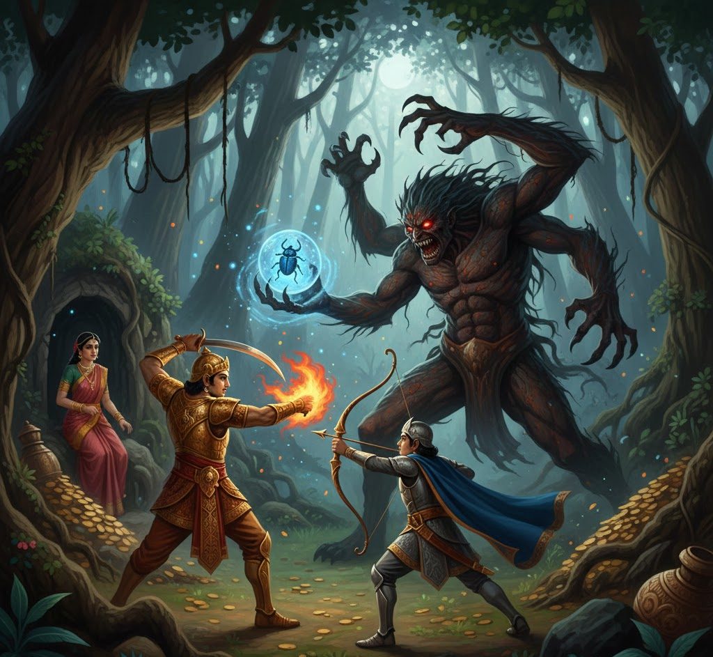 রাক্ষসটি দুই ভাইকে দেখে প্রলুব্ধ হয় এবং তাদের বন্দী করার চেষ্টা করে। কিন্তু নবকুমার এবং দুধকুমার তাদের যুদ্ধবিদ্যা এবং বুদ্ধির জোরে রাক্ষসের আক্রমণ প্রতিহত করে।