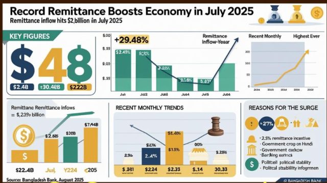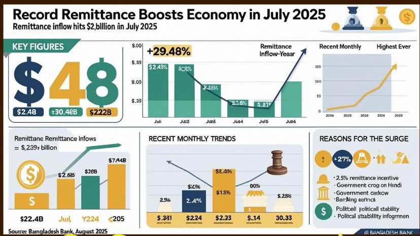 ২০২৫-২৬ অর্থবছরের শুরুতেই রেমিট্যান্সে রেকর্ড সুখবর। জুলাইয়ে এসেছে ২৪৮ কোটি ডলার, যা গত বছরের তুলনায় প্রায় ৩০ শতাংশ বেশি। অর্থনীতিতে ফিরছে স্থিতিশীলতা।
