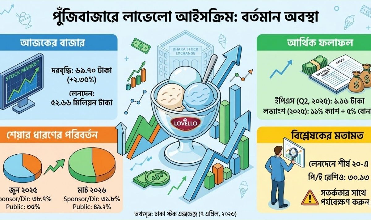 - ডিএসইতে আজ লেনদেনের শীর্ষ ২০ কোম্পানির তালিকায় শক্তিশালী অবস্থানে রয়েছে লাভেলো আইসক্রিম (LOVELLO)।
