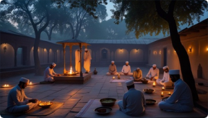 সন্ধ্যার পর প্রদীপ জ্বলে ওঠে। বাতাসে ধূপের গন্ধ, দূর থেকে ভেসে আসে বাঁশির মৃদু সুর। এই সময়েও চলতে থাকে গান, কিন্তু তাতে থাকে একরকম বিষাদ—যেন দিনশেষের নিঃশব্দ বিদায়। এক বাউল গাইছেন, “এই দেহের মাঝে আছে রে এক অচিন মানুষ…” গানটি আখড়ার দেয়াল ছুঁয়ে ধীরে ধীরে মিলিয়ে যায় রাতের অন্ধকারে।