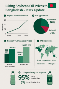 বিশ্ববাজারে ক্রুড সয়াবিন তেলের দাম গত এক মাসে টনপ্রতি ১,০৫০ ডলার থেকে বেড়ে দাঁড়িয়েছে প্রায় ১,১০০–১,১৫০ ডলারে। ব্রাজিলে খরার কারণে উৎপাদন হ্রাস ও আর্জেন্টিনায় রপ্তানি শুল্ক বৃদ্ধির আশঙ্কায় বাজারে অস্থিরতা তৈরি হয়েছে। এর প্রভাব পড়ছে বাংলাদেশের আমদানি ব্যয়ে।