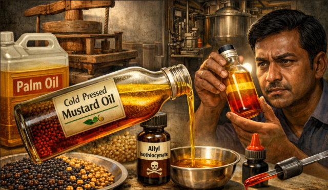 ১. কৃত্রিম ঝাঁঝ ও অ্যালিল আইসোথায়োসায়ানেট: খাঁটি সরিষার তেলের স্বাভাবিক ঝাঁঝ থাকে। কিন্তু অসাধু ব্যবসায়ীরা সস্তা সয়াবিন বা পাম অয়েলের সাথে ‘অ্যালিল আইসোথায়োসায়ানেট’ (Allyl Isothiocyanate) নামক কেমিক্যাল মিশিয়ে কৃত্রিম ঝাঁঝ তৈরি করে। এই কেমিক্যাল মেশালে কয়েক ফোঁটা তেলেই নাকে-মুখে ঝাপটা লাগে, যা সাধারণ মানুষ ‘খুবই খাঁটি’ বলে ভুল করেন। এটি পাকস্থলীর দেয়ালের মারাত্মক ক্ষতি করে।