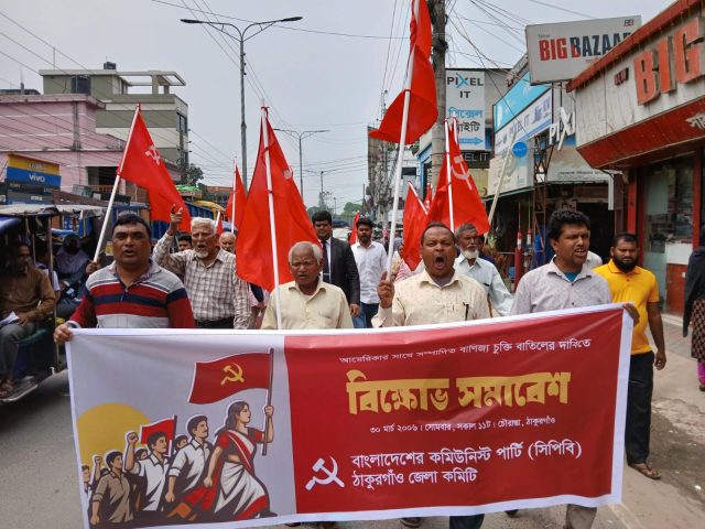 সোমবার (৩০ মার্চ) দুপুরে জেলা সিপিবির উদ্যোগে একটি বিক্ষোভ মিছিল বের করা হয়। মিছিলটি ঠাকুরগাঁও শহরের প্রধান প্রধান সড়ক প্রদক্ষিণ শেষে স্থানীয় চৌরাস্তায় এক সমাবেশে মিলিত হয়।