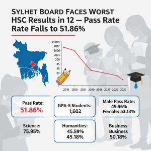 বিজনেসটুডে২৪ প্রতিনিধি, সিলেট: চলতি বছরের উচ্চ মাধ্যমিক সার্টিফিকেট (এইচএসসি) ও সমমান পরীক্ষার ফলাফলে সিলেট শিক্ষা বোর্ডে নেমেছে এক নজিরবিহীন ধস। গত ১২ বছরের মধ্যে এবারের ফলাফল সবচেয়ে খারাপ। বোর্ডে পাসের হার নেমে এসেছে মাত্র ৫১ দশমিক ৮৬ শতাংশে—অর্থাৎ প্রায় অর্ধেক শিক্ষার্থী অকৃতকার্য।