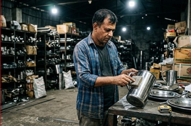 ৩. ওজন ও পুরুত্বে কারচুপি (Gauge Deception): স্টিল সামগ্রীর স্থায়িত্ব নির্ভর করে এর পুরুত্বের ওপর। অনেক সময় হাঁড়ি বা জগের নিচের অংশ (Bottom) ভারি করার জন্য ভেতরে বালু বা সস্তা লোহা ঢুকিয়ে সিল করে দেওয়া হয়। এতে হাতে নিলে ভারি মনে হলেও রান্নার সময় নিচের অংশ দ্রুত পুড়ে যায় বা ফেটে যায়।