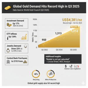 আন্তর্জাতিক ডেস্ক: বিশ্বজুড়ে ভূ-রাজনৈতিক অস্থিরতা, অর্থনৈতিক অনিশ্চয়তা এবং বিনিয়োগকারীদের নিরাপদ আশ্রয়ের খোঁজে চলতি বছরের তৃতীয় প্রান্তিকে (জুলাই–সেপ্টেম্বর) স্বর্ণের চাহিদা রেকর্ড উচ্চতায় পৌঁছেছে। বিশ্ব স্বর্ণ পরিষদের (ওয়ার্ল্ড গোল্ড কাউন্সিল ) সর্বশেষ প্রতিবেদন অনুযায়ী, এই সময়ে বিশ্বব্যাপী স্বর্ণের চাহিদা গত বছরের একই সময়ের তুলনায় ৩ শতাংশ বেড়ে ১,৩১৩ মেট্রিক টনে দাঁড়িয়েছে, যা এ যাবৎকালের সর্বোচ্চ ত্রৈমাসিক চাহিদা।