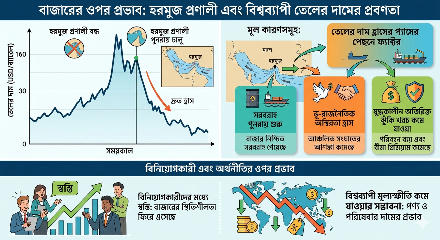 বাজার বিশ্লেষণে দেখা গেছে, হরমুজ প্রণালী উন্মুক্ত হওয়ার ঘোষণার পরপরই আন্তর্জাতিক বেঞ্চমার্ক ব্রেন্ট ক্রুডের দাম ব্যারেল প্রতি ১০ শতাংশেরও বেশি কমে ৮৮-৮৯ ডলারের নিচে নেমে এসেছে। এর আগে যুদ্ধের আশঙ্কায় এই দাম ব্যারেল প্রতি ১১৮ ডলার পর্যন্ত উঠে গিয়েছিল। অন্যদিকে, ওয়েস্ট টেক্সাস ইন্টারমিডিয়েট (WTI) তেলের দামও উল্লেখযোগ্য হারে কমেছে।
