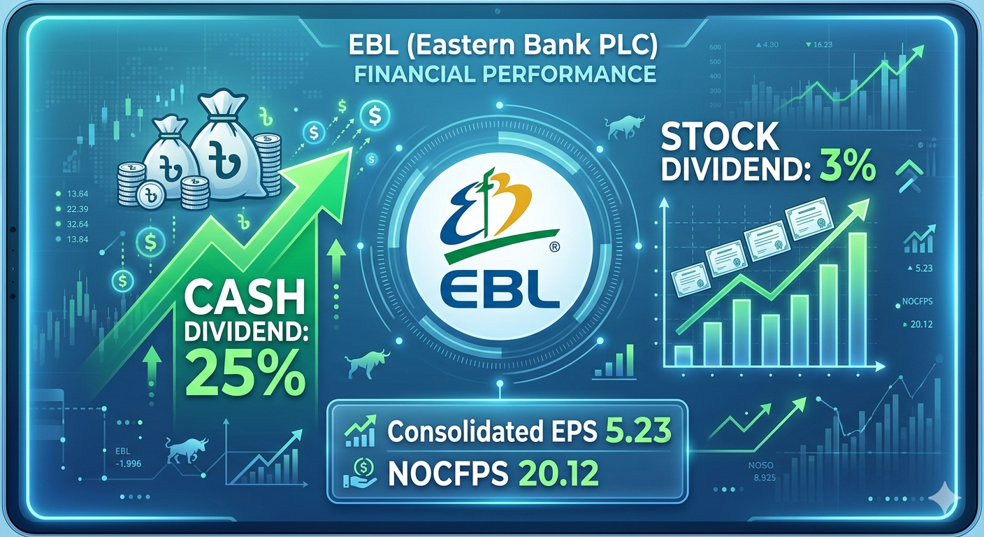 বিজনেসটুডে২৪ প্রতিনিধি, ঢাকা: দেশের পুঁজিবাজারে তালিকাভুক্ত ব্যাংকিং খাতের প্রতিষ্ঠান ইস্টার্ন ব্যাংক পিএলসি (EBL) গত ৩১ ডিসেম্বর, ২০২৫ তারিখে সমাপ্ত বছরের জন্য লভ্যাংশ ঘোষণা করেছে। ব্যাংকের পরিচালনা পর্ষদ সাধারণ শেয়ারহোল্ডারদের জন্য মোট ২৮ শতাংশ লভ্যাংশ প্রদানের সুপারিশ করেছে, যার মধ্যে ২৫ শতাংশ নগদ (Cash) এবং ৩ শতাংশ স্টক (Stock) লভ্যাংশ।
